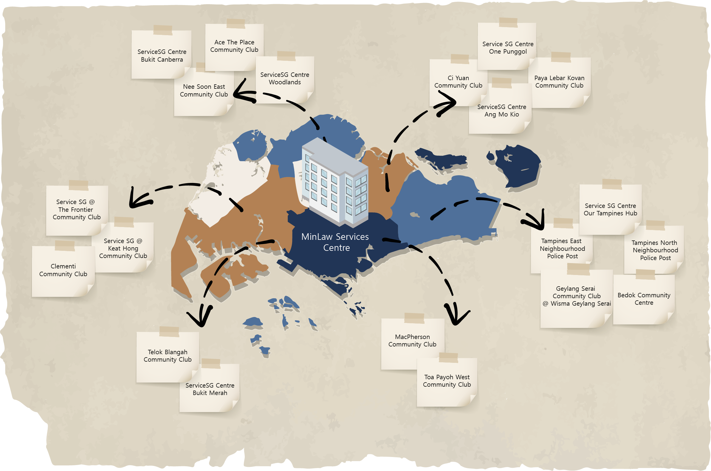 சட்ட அமைச்சின் சேவை நிலைத்தில் உள்ள சமூக சமரச நிலையத்தைத் தவிர, நாங்கள் 20 தீவளாவிய சமரச இடங்களில் தொண்டூழிய சமரசத்தையும் வழங்குகிறோம்: